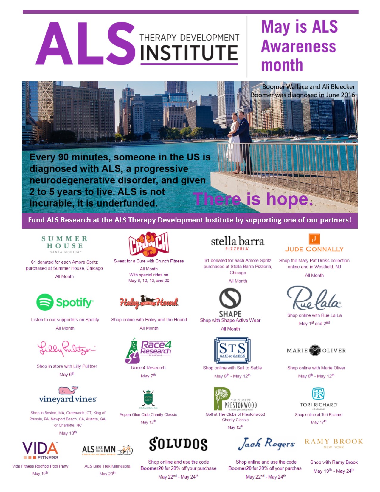 - May 22nd – 24th shop online at Soludos and Jack Rogers with code Boomer20 and receive 20% off your purchase and 10% of net sales will be donated to ALS TDI!